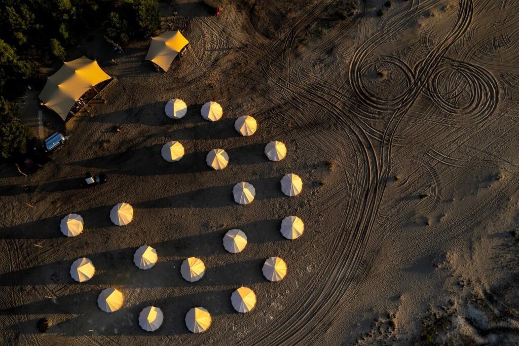 W cenie wynajmu namiotu znajduje się namiot z wyposażeniem: łóżka ( 2 lub 4 łóżka w namiocie wg opcji jaką wybierzesz), pościel, poduszki, kołdry, stolik, krzesło, turystyczna lampa ledowa, wieszak na ubrania, dywan, 2 szafki nocne, stolik, lampę + powerbank 30000 mAh, latarenki LED, lusterko z makramy, kłódki do namiotów, girlandy materiałowe i dekoracje, krzesła/leżaki. Gruba podłoga z maty kokosowej (izoluje od ziemi) i drewniane duże oznaczenie namiotów